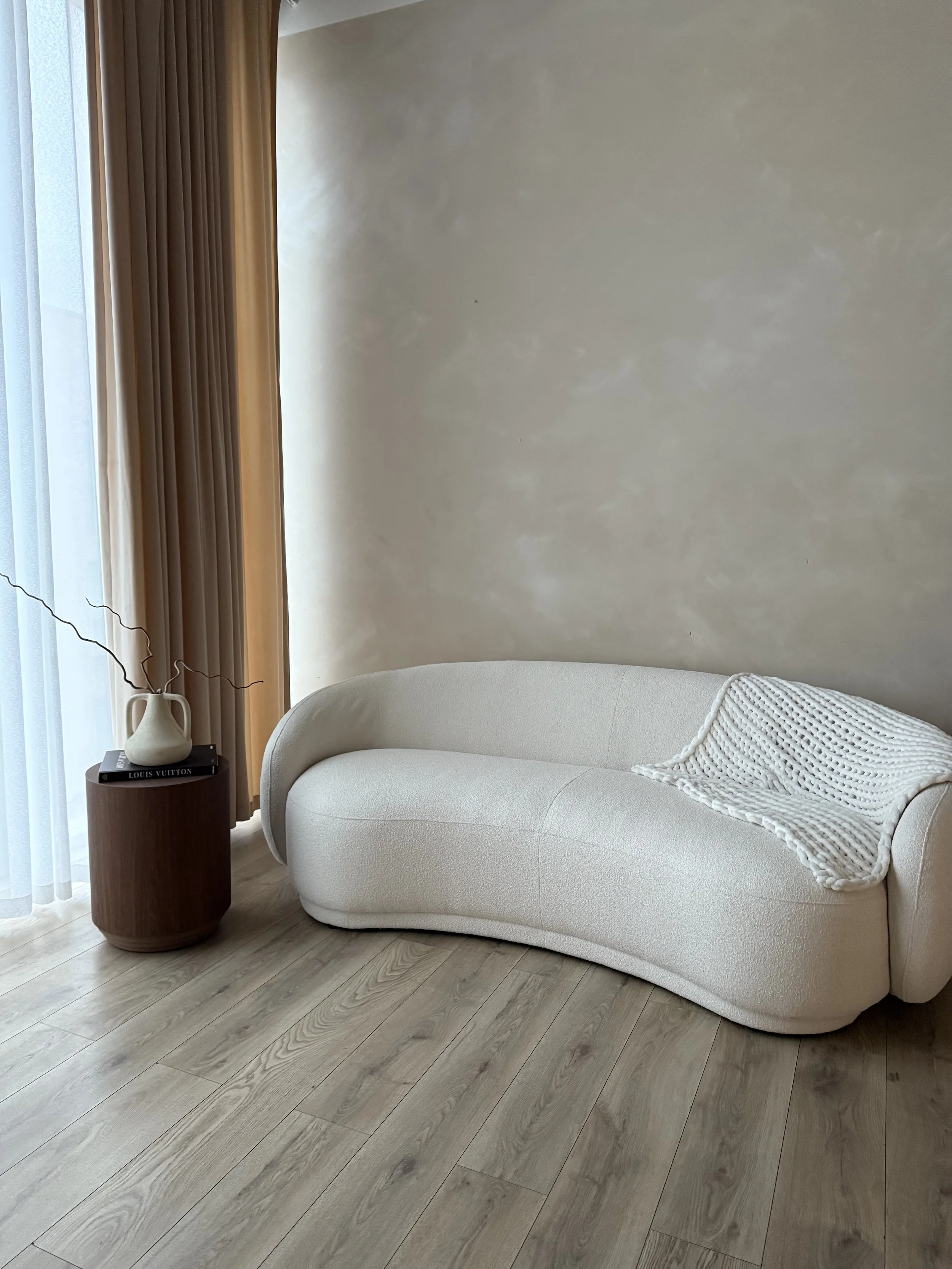 A large, curved boucle statement couch and boucle pumpkin sofa